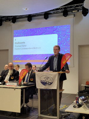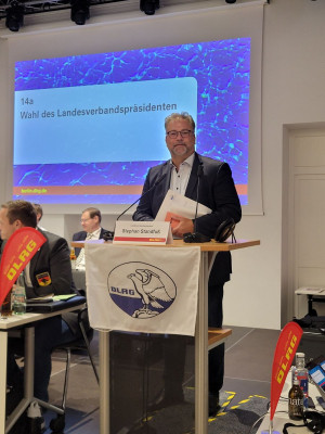 Besonders gefreut haben sich die Delegierten über die Grußworte vom Präsidenten des Landessportbundes. Thomas Härtel lobte das Engagement der DLRG Berlin. Er betonte auch die durchaus gute und wichtige Zusammenarbeit.
